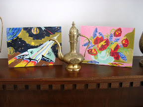 Don’t they look just lovely sitting on my fireplace mantle? I went off on my own on the spaceship painting. White seemed so typical so I decided to go RAINBOW! Staying in the lines has never been my strong point.