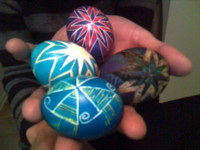 Yesterday I had Mom, Lisa, Audra, and Pookie Bear’s sister and nephew over to do Pysanky. The weather was rough and the electricity went out but it didn’t matter. We don’t need electricity doing Pysanky! (actually it’s nice to have when removing the wax but we improvised). I told Joan and John about how Pysanky teaches you patience and the temporal quality of life… there’s always a chance you might drop the egg after you’ve spent many hours decorating it. AND THEN I DROPPED MY BEAUTIFUL EGG! I wanted to cry but I stayed calm.